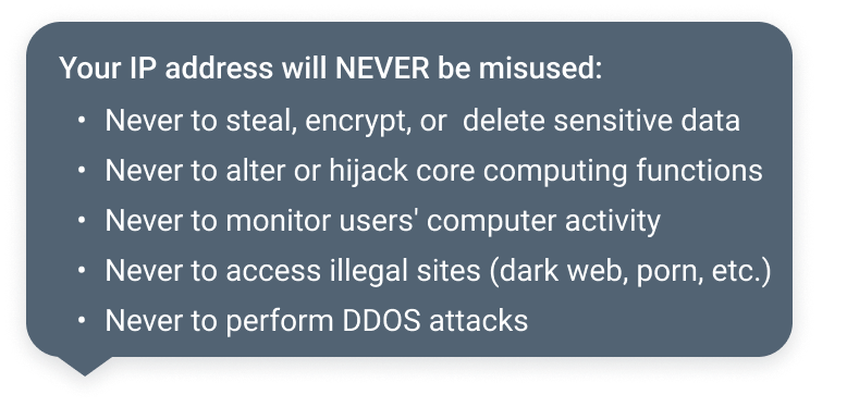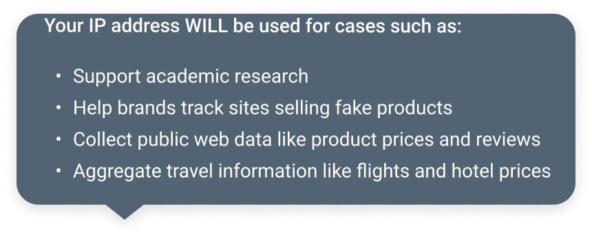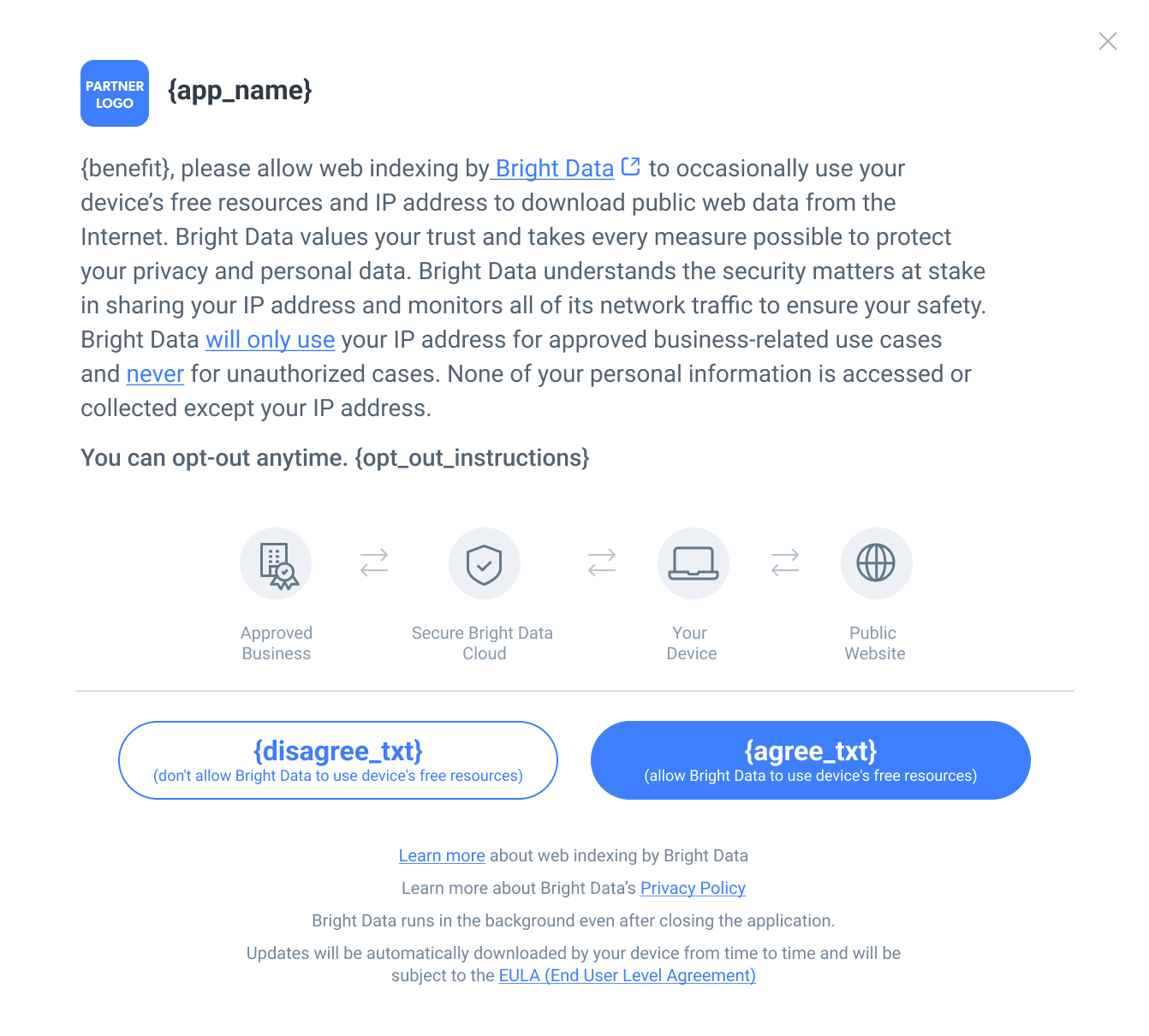 Text: “To [Benefit to user], please allow web indexing by Bright Data to occasionally use your device’s free resources and IP address to download public web data from the Internet.”