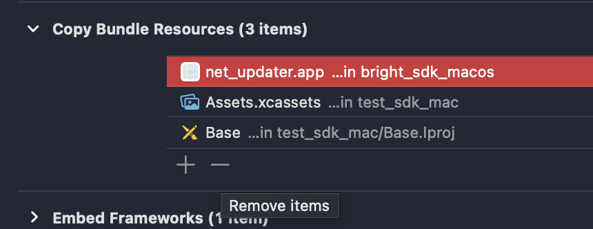 - Navigate to Build Phases and in section Copy Bundle Resources remove net_updater.