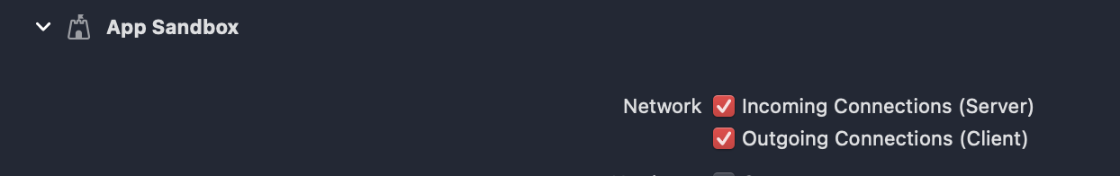 - If you have app sandbox entitlement, select incoming and outgoing network connections there. (Note the SDK doesn't support distributing through AppStore)