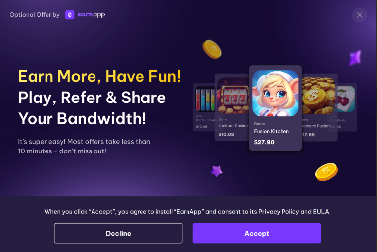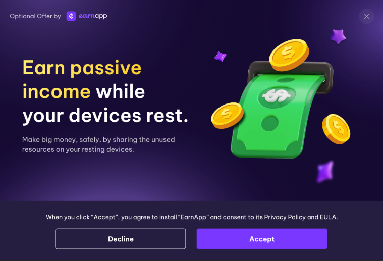 - When you click “Accept”, you agree to install “EarnApp” and consent to its Privacy Policy and EULA.