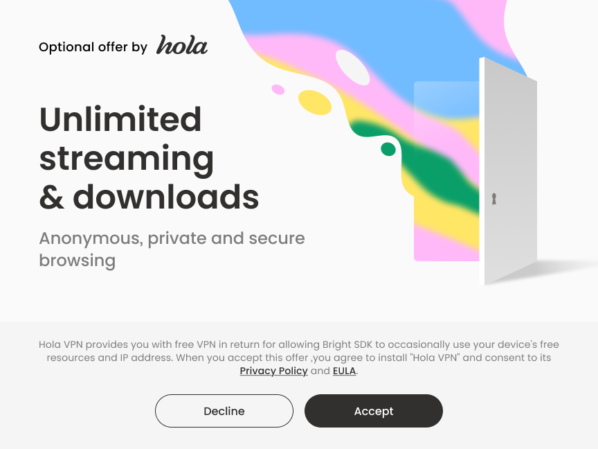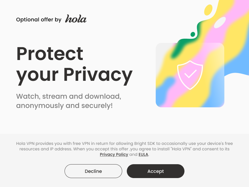 Hola VPN provides you with free VPN in return for allowing Bright SDK to occasionally use your device's free resources and IP address. When you click “Accept”, you agree to install “Hola VPN” and consent to its Privacy Policy and EULA.