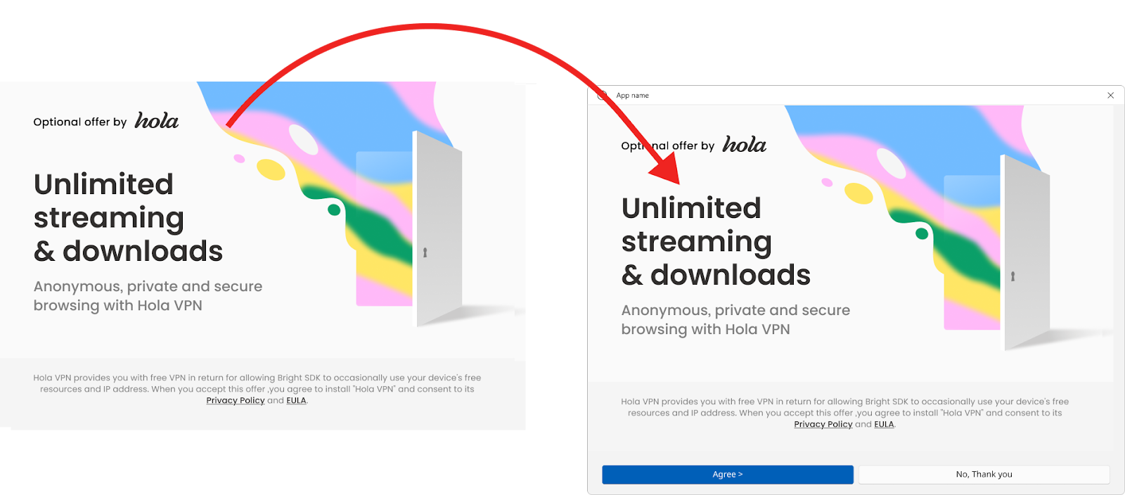 Users must ALWAYS decide if they want to VOLUNTARILY install Hola VPN after seeing the offer and consent screen. Additionally, users should ALWAYS have a straightforward means to opt out of the installation process.